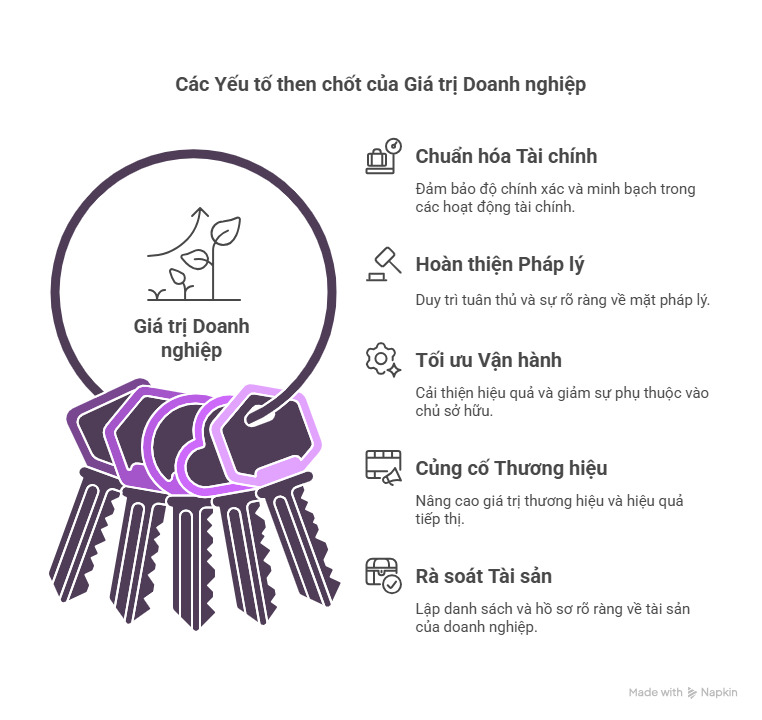 - Hoàn thiện Pháp lý: Rà soát giấy phép, hợp đồng, tuân thủ quy định pháp luật để đảm bảo doanh nghiệp “sạch” về mặt pháp lý.