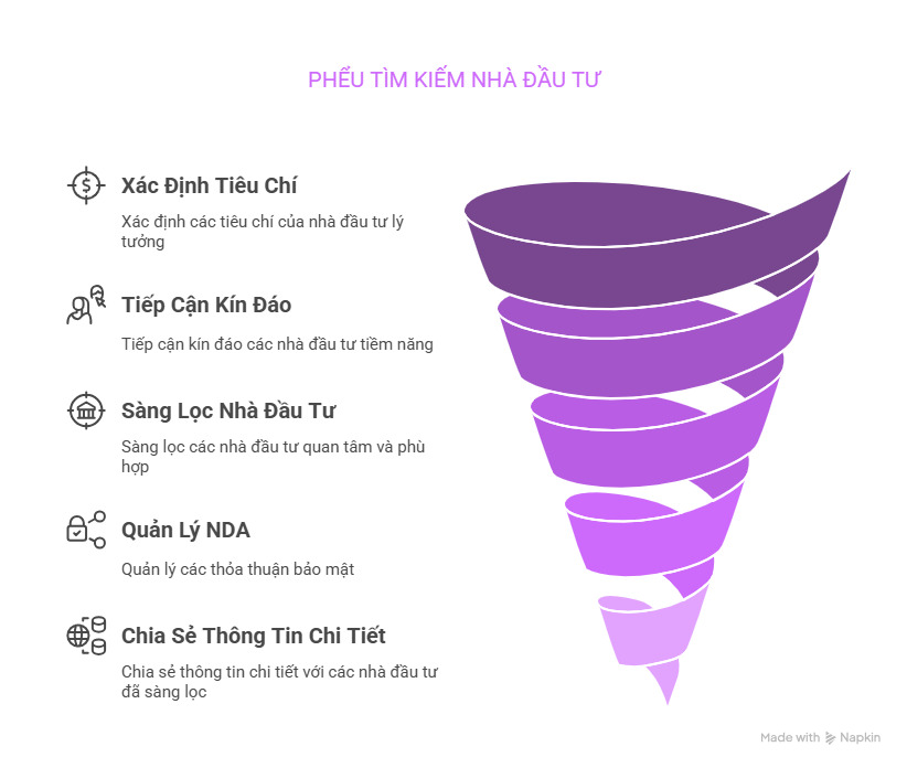 - Quy trình tìm kiếm chuyên nghiệp và bảo mật: Chúng tôi giúp anh chị xác định rõ tiêu chí về nhà đầu tư lý tưởng. Sau đó, dựa trên phân tích chuyên sâu và mạng lưới của mình, chúng tôi chủ động tìm kiếm và tiếp cận các đối tượng tiềm năng một cách kín đáo, thường bắt đầu bằng việc giới thiệu ẩn danh (Teaser) để bảo vệ thông tin của anh chị.